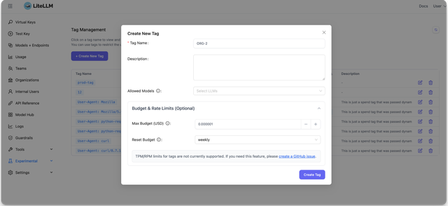 Create a tag to represent a cost center, project, or any budget category. Set max_budget